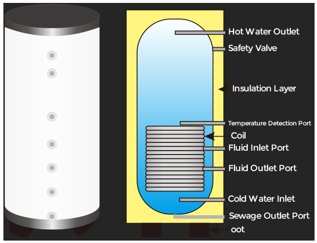 Kann an Heizgeräte wie Kessel und Wärmepumpen angeschlossen werden, um heißes Wasser für den gelegentlichen Gebrauch zu speichern.